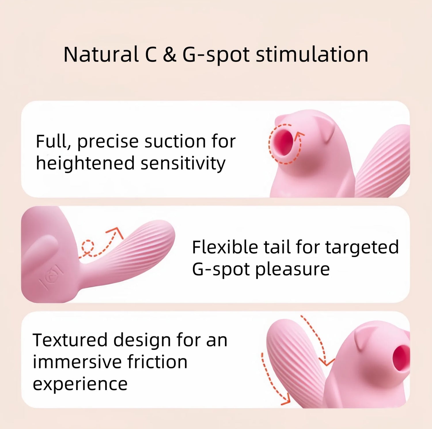 Präzise Saugfunktion, flexibler Schwanz und strukturierte Oberfläche sorgen für gezielte, intensive Stimulation